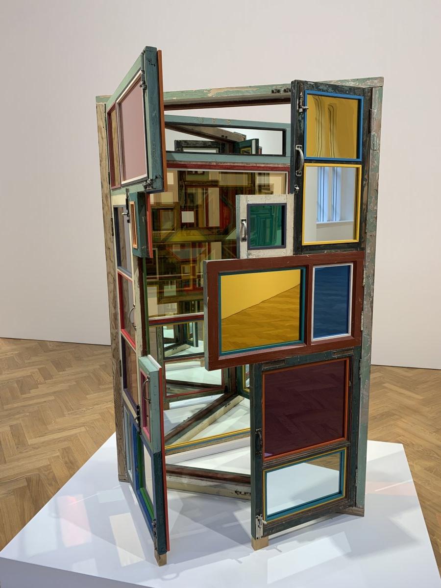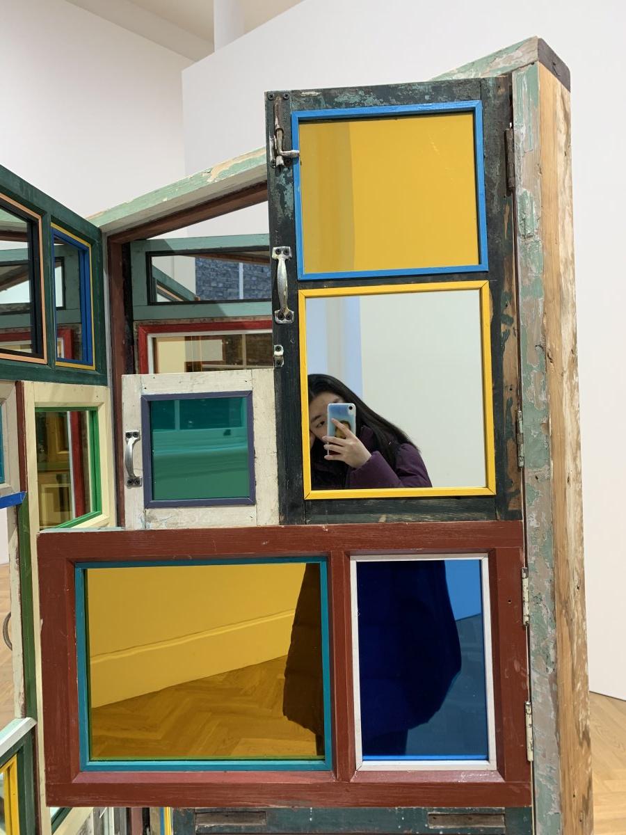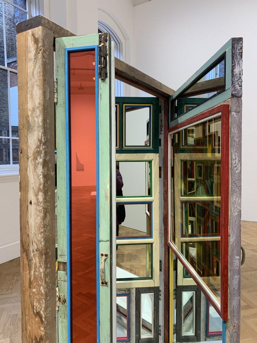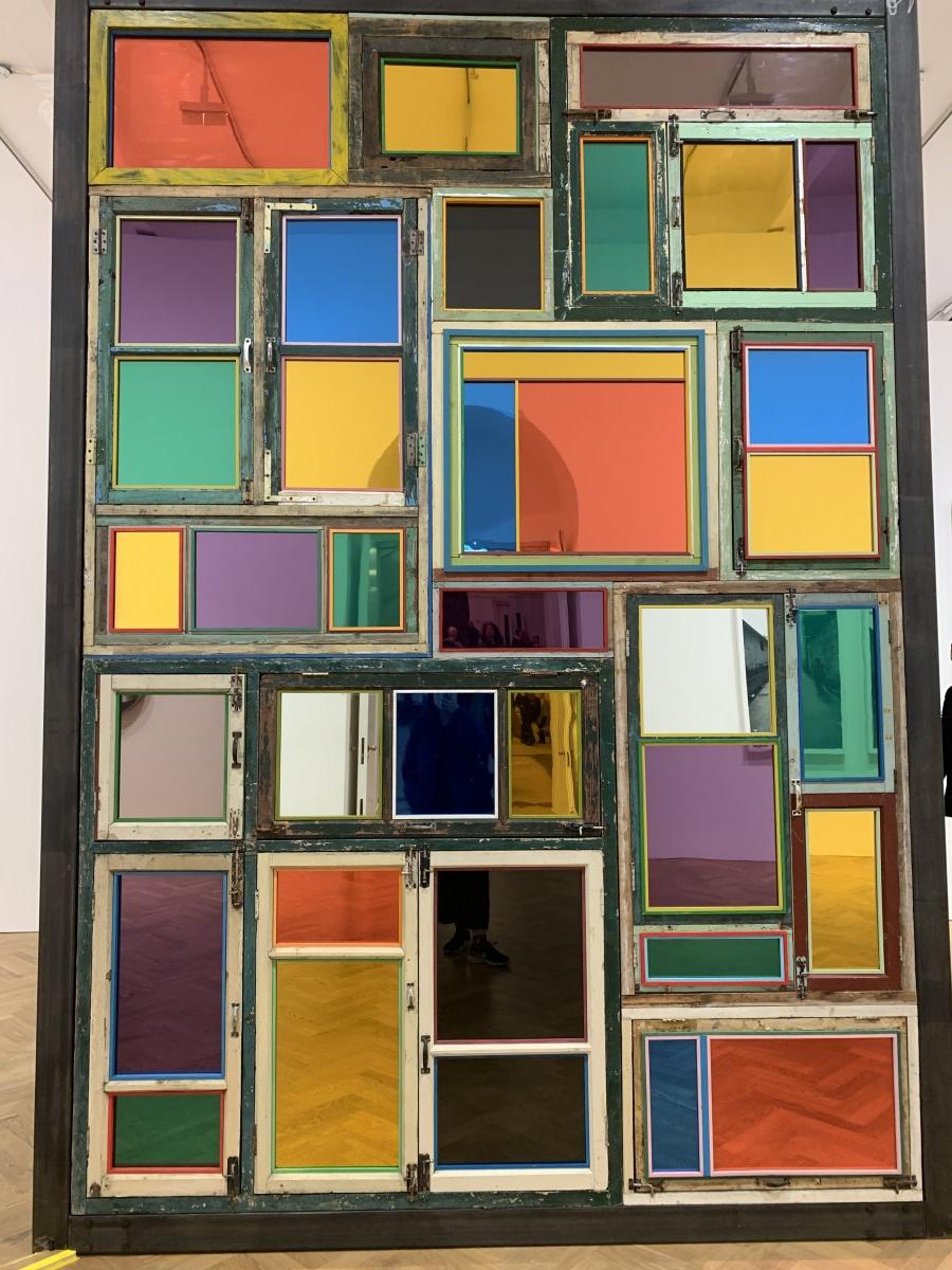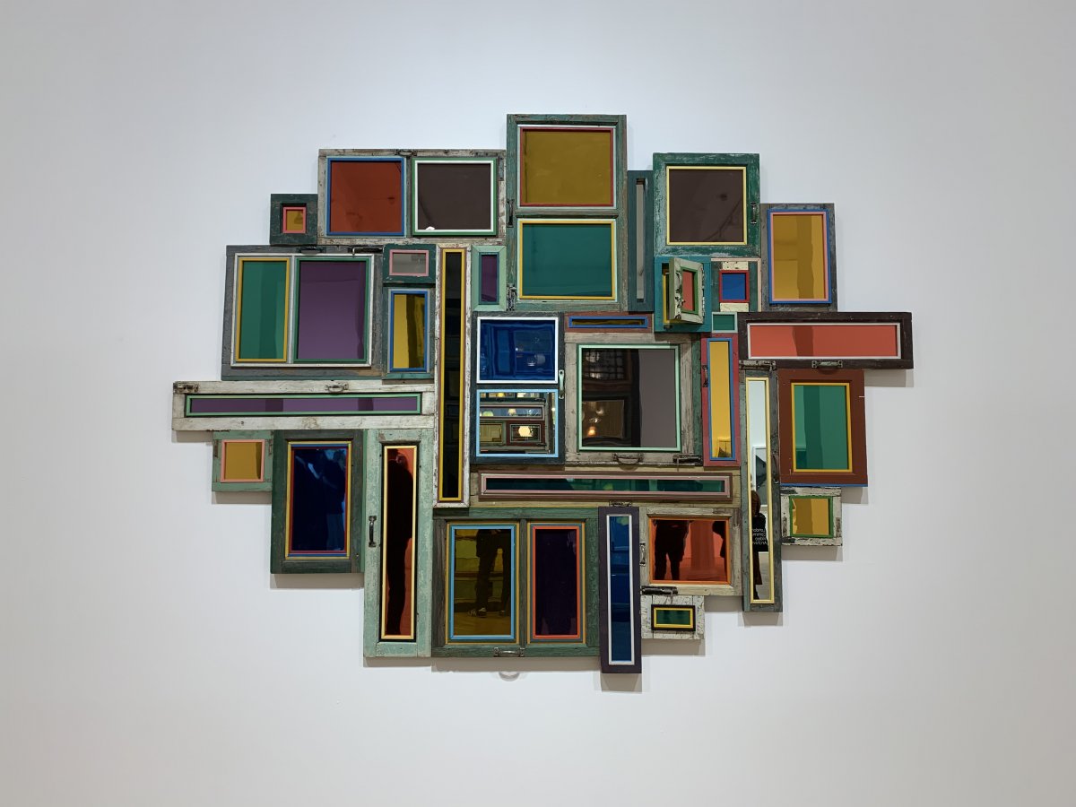 Same Bed Different Dreams No. 3 (2018) has been created using everyday household objects, such as crockery, pendant lights and decorative knick-knacks. These mundane objects are presented on a double bed carrying the memory of the rise of his generation, behind a polished case composed of salvaged window panels, the useless byproduct of modernization. Though each window has been carefully enhanced by Song Dong with vibrantly coloured mirror or glass, their recycled nature is nevertheless evident from the still flaking paint and rusting latches. These collaged remnants of people’s homes carry with them the history of a city and the lives of its people. As viewers are invited to peek inside, they are transformed into voyeurs: imagining their homes, their stories and perhaps identifying shared experiences, and primed to think of the future.