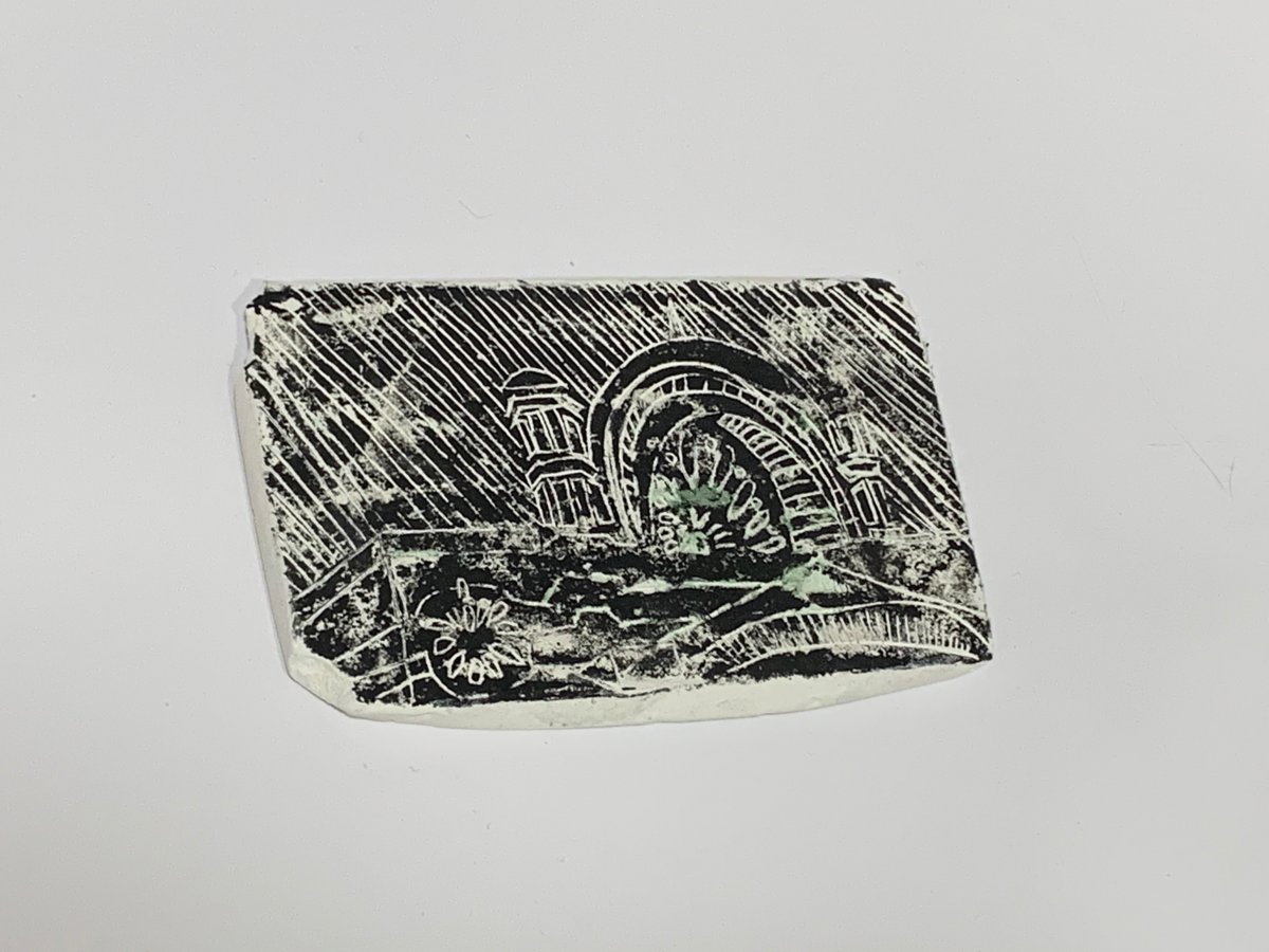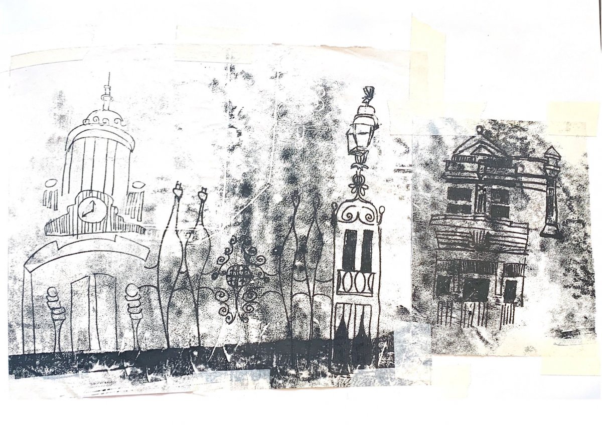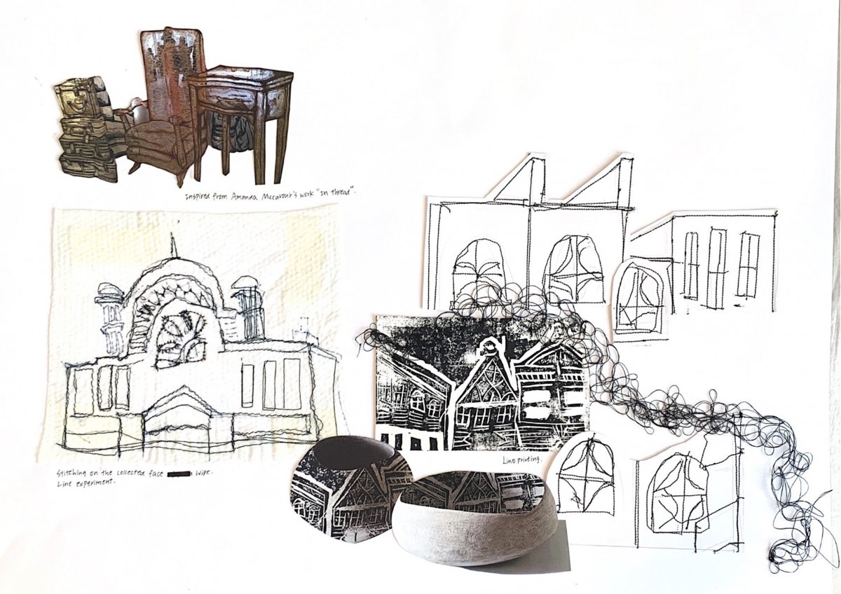 I also used Lino printing and hand knitting to explore the feeling of linear for the buildings' structure.