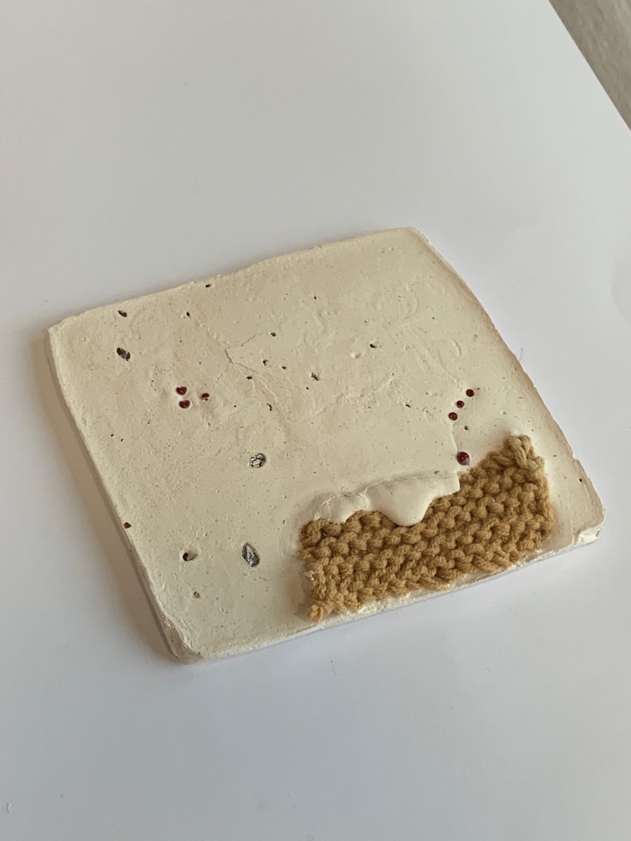 For the final works, I combined the face warps with linear buildings pattern and the plaster together. There are two reasons why I want to use face warps as base fabrics to sew the building structures. One is because, from the 'Too much' project, I started to focus on sustainable materials, so I will collect everything in my daily life could be used to do textile design. Another reason is, I found that when the face warps get wet, it will become invisible. In this case, I guessed if the wet face warps are put into the plaster water that has not solidified when the plaster is solidified, only the sewing thread can be displayed on the plaster as a pattern.
